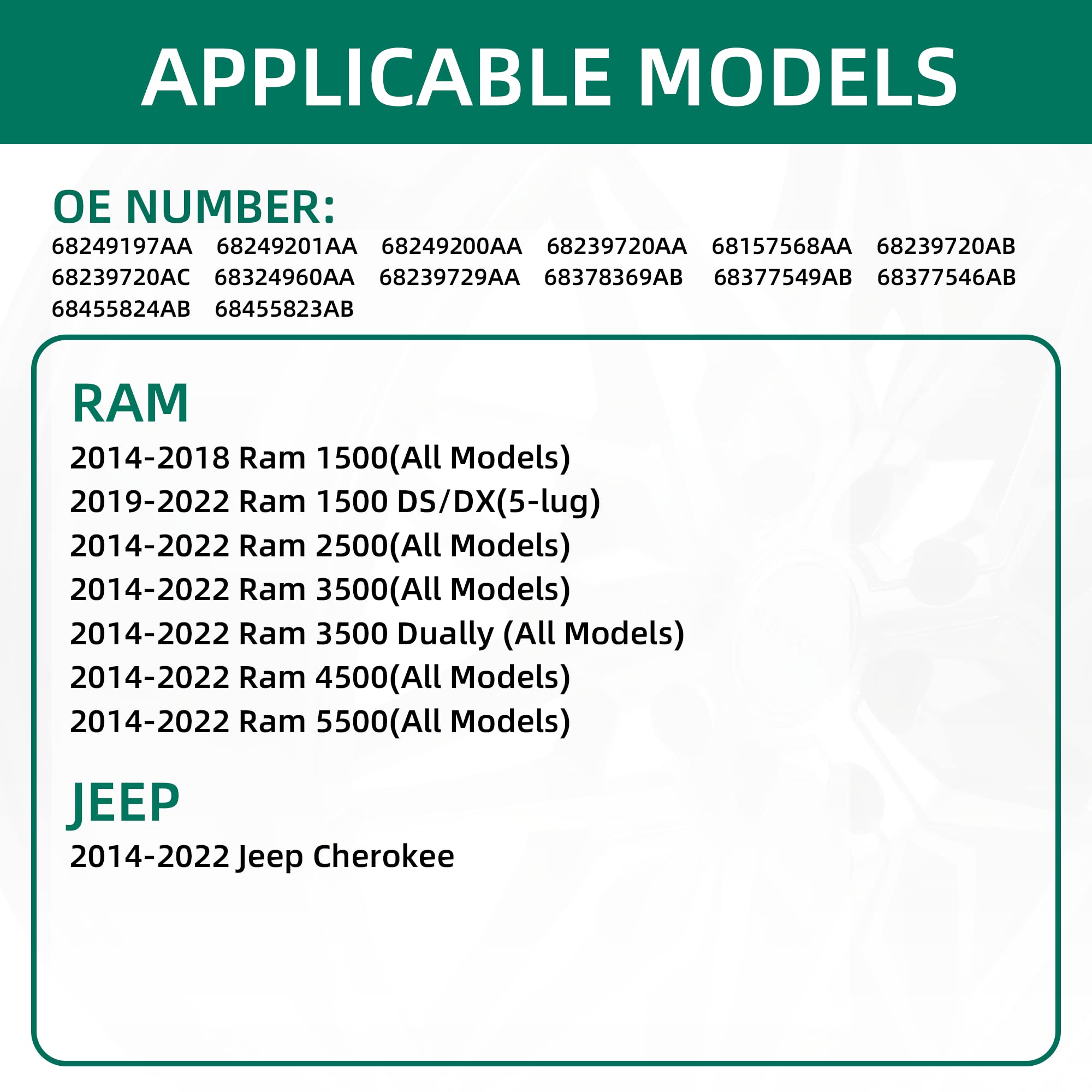 - 【PREFECT REPLACEMENT】The TPMS is Compatible with 2014-2021 JEEP CHEROKEE, 2014-2022 RAM 150(DS/DX(5-lug), 2014-2022 RAM 2500, 2014-2021 RAM 3500,2014-2022 RAM 4500.2014-2022 RAM 5500 (Note:The tpms sensors can not fit 2019-2022 RAM 1500 DT-(6lug),see picture for specific model)。Please double check the compatibilty before purchase to avoid unnecessary installation fees.