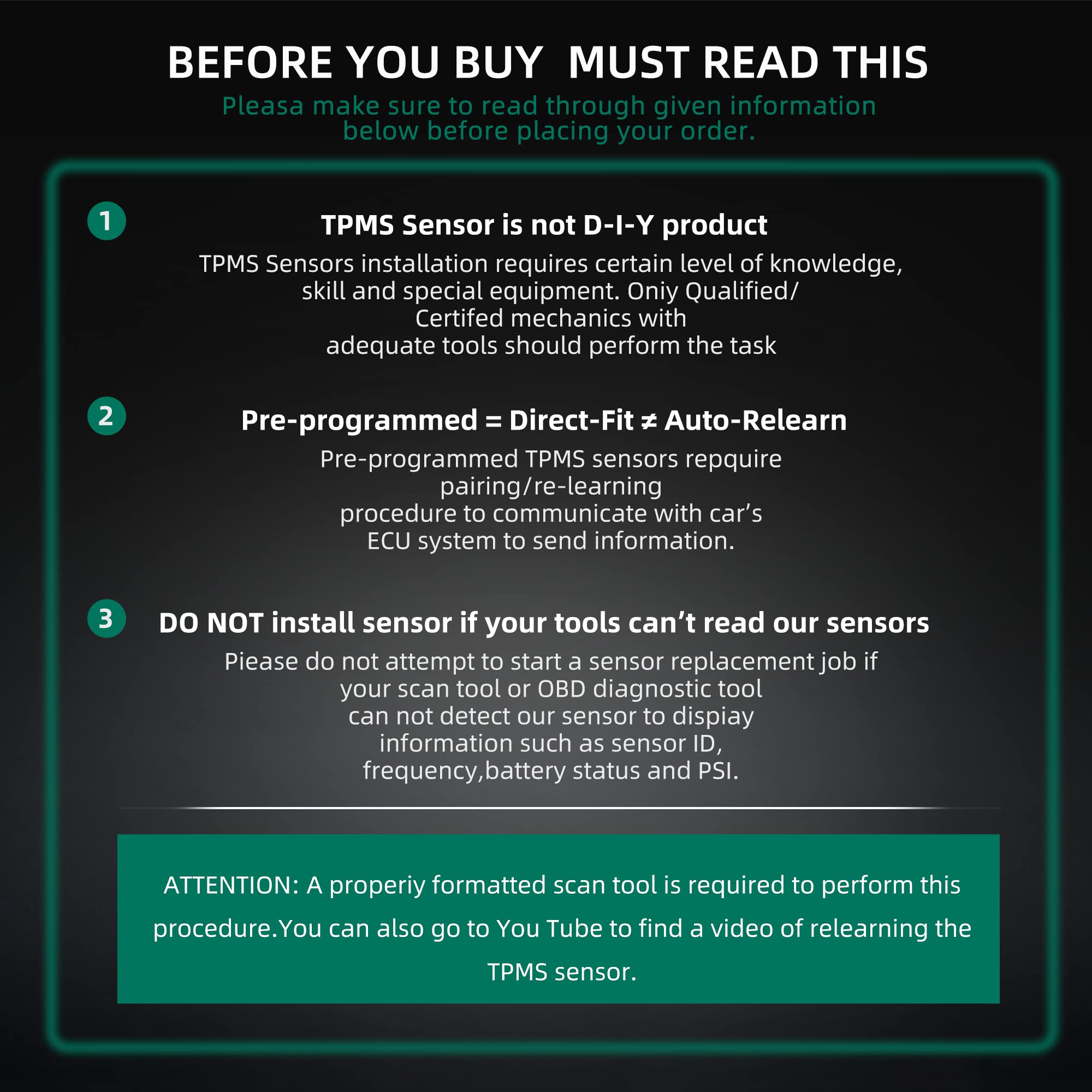 - 【Professional Testing】Each TPMS is tested before leaving the factory to ensure trouble-free installation and performance. We provide a one-year warranty on our products, if you encounter problems, please contact us and we will reply within 24 hours.