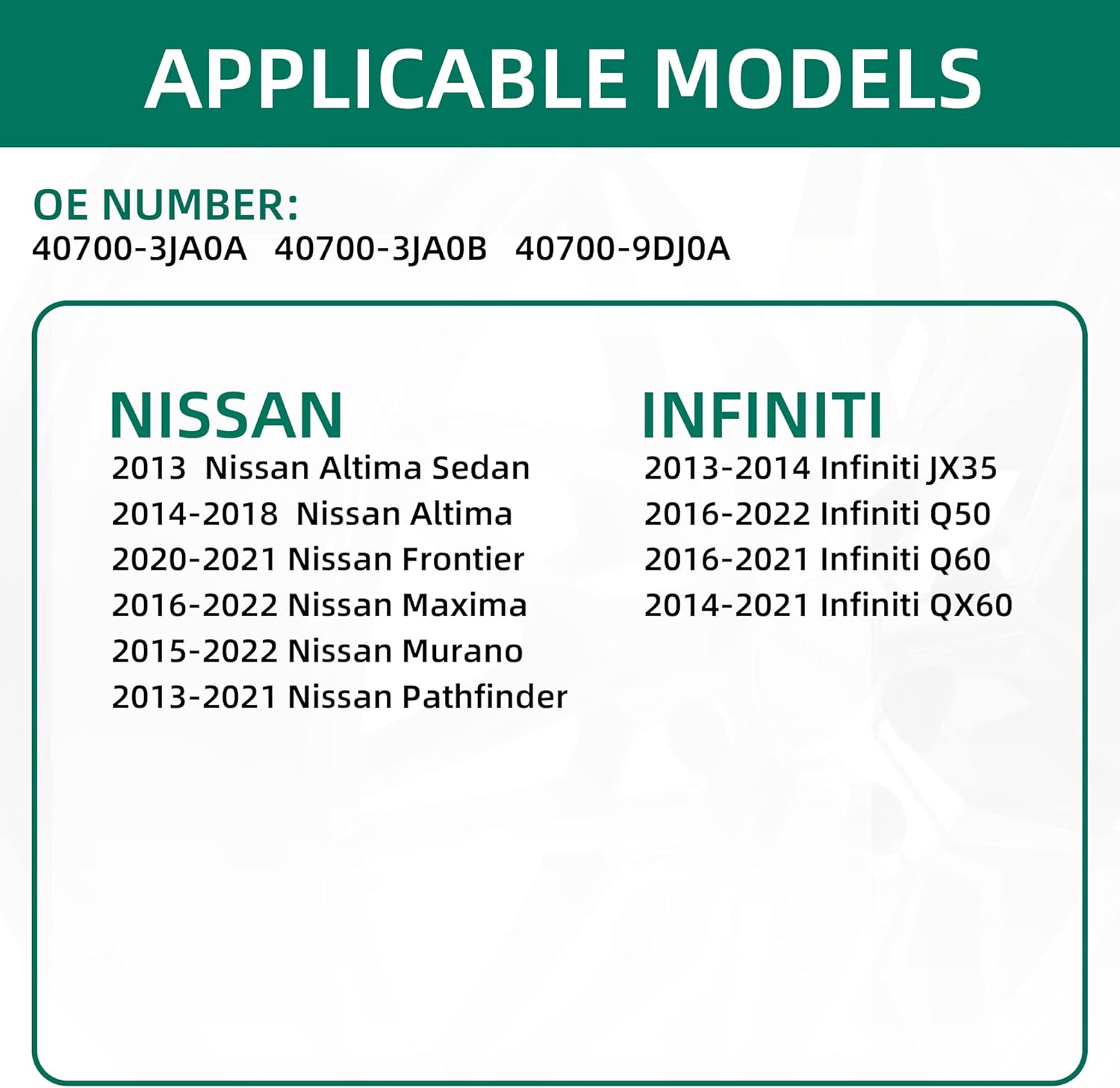 - 【PREFECT REPLACEMENT】The tire pressure monitor system (TPMS) is Compatible with 2013-2014 Infiniti JX35,2016-2022 Infiniti Q50,2016-2021 Infiniti Q60,2014-2021 Infiniti QX60,2013-2018 Nissan Altima,2020-2021 Nissan Frontier,2016-2022 Nissan Maxima,2015-2022 Nissan Murano,2013-2021 Nissan Pathfinder (see picture for specific model).Please double check the compatibilty before purchase to avoid unnecessary installation fees.