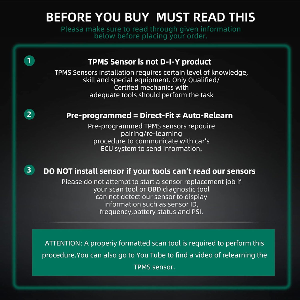 - 【NO SENSOR PROGRAMMING REQUIRED 】The tire pressure monitor system (TPMS) come pre-programmed specifically for your make/model/year of vehicle,just need activate them with scan tool.