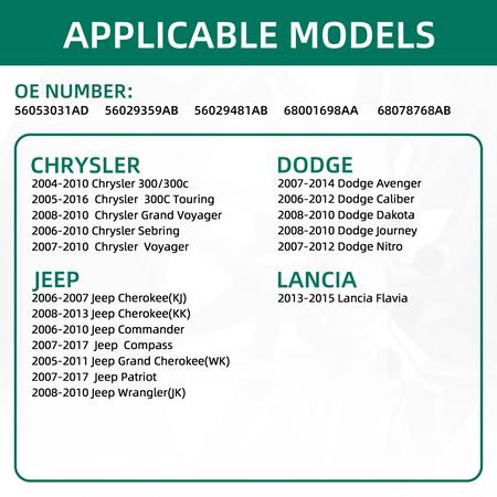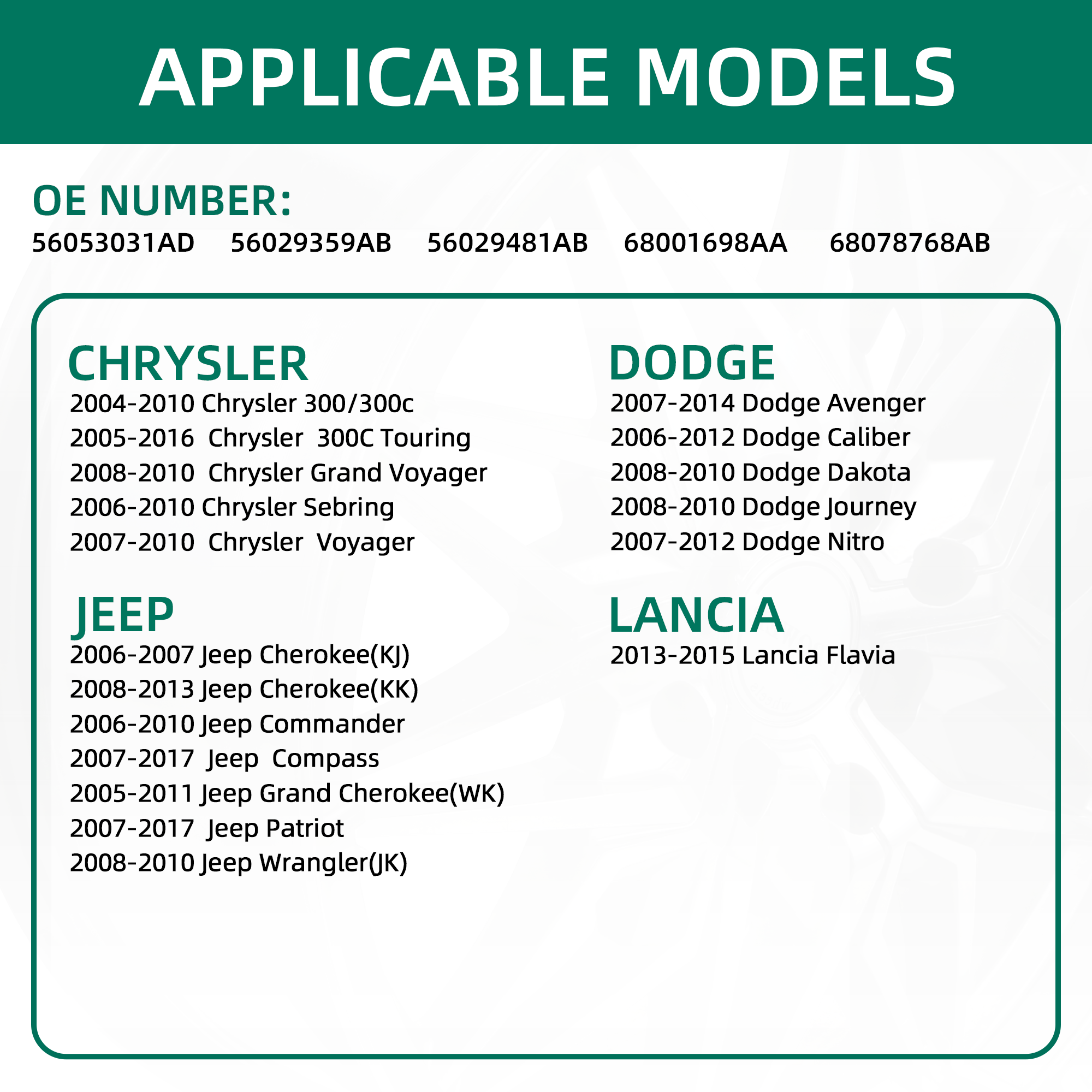 - 【PREFECT REPLACEMENT】The tire pressure monitor system (TPMS) is Compatible with CHRYSLER ,JEEP , DODGE,LANCIA (see picture for specific model)。Please double check the compatibilty before purchase to avoid unnecessary installation fees.