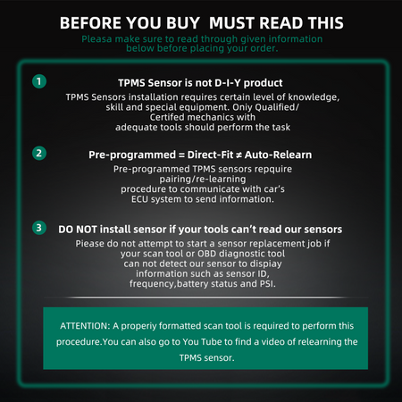 - 【NO SENSOR PROGRAMMING REQUIRED 】The tire pressure monitor system (TPMS) come pre-programmed specifically for your make/model/year of vehicle,just need activate them with scan tool.