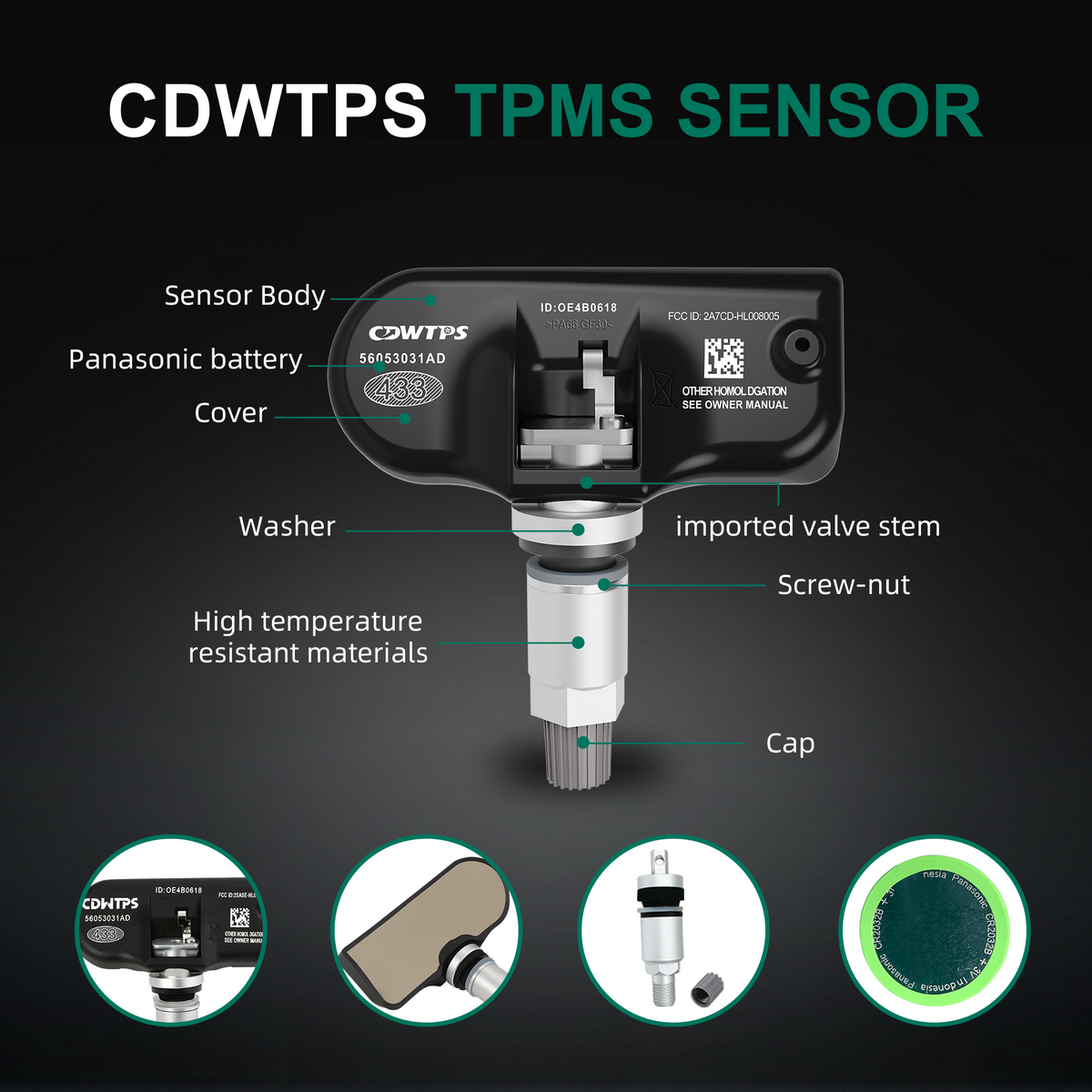 CDWTPS TPMS Sensor, 433MHZ Tire Pressure Monitoring System 4 Pack, for CHRYSLER | JEEP |DODGE | LANCIA Automotive Replacement Part # 56053031AD 56029359AB 56029481AB 68001698AA 68078768AB