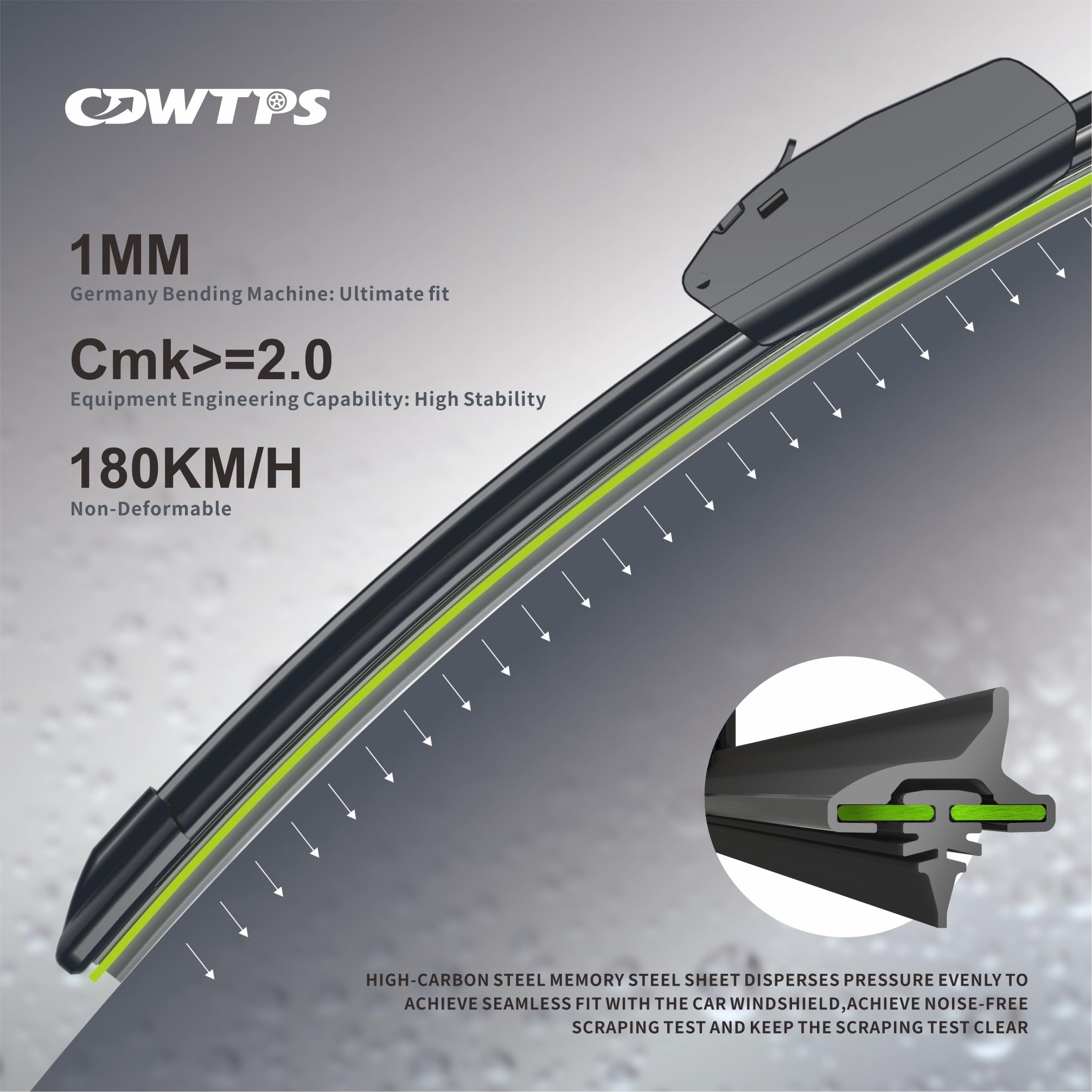 - 【Advanced Production Process】The windshield wipers adopt elastic memory steel sheets and asymmetric spoilers, featuring an asymmetrical design that provides even pressure points and effectively conforms to the curvature of the windshield during operation.